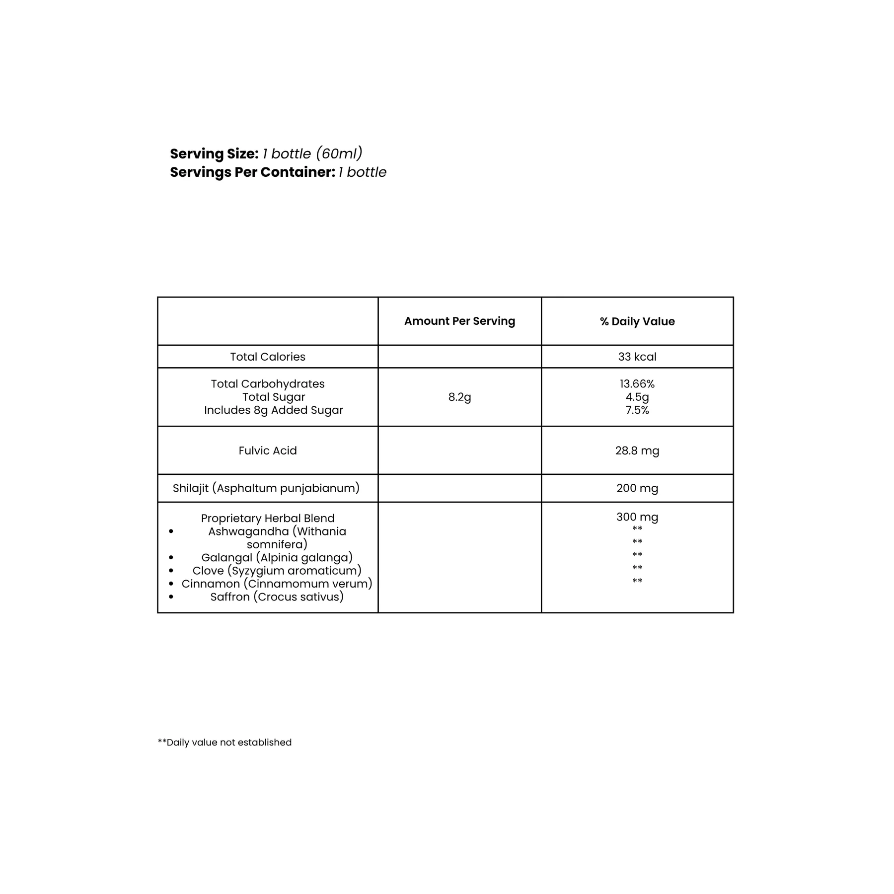 For optimal results and to increase performance during periods of increased mental and physical exertion, we recommend consuming one full Mirth Shilajit Shot Energy Drink (75ml serving size, as listed in the ingredients) per day. You can take the shot directly or mix it with a glass of water or juice. For the best consistency, we advise taking it consistently at the same time each day.